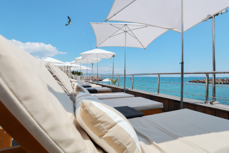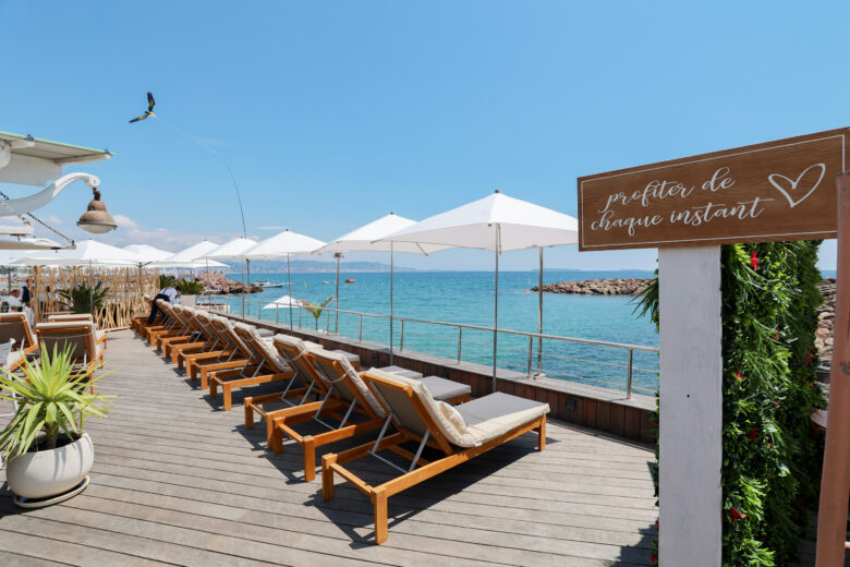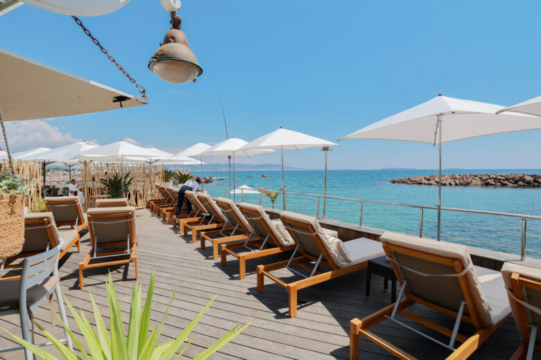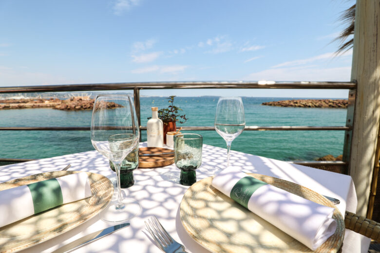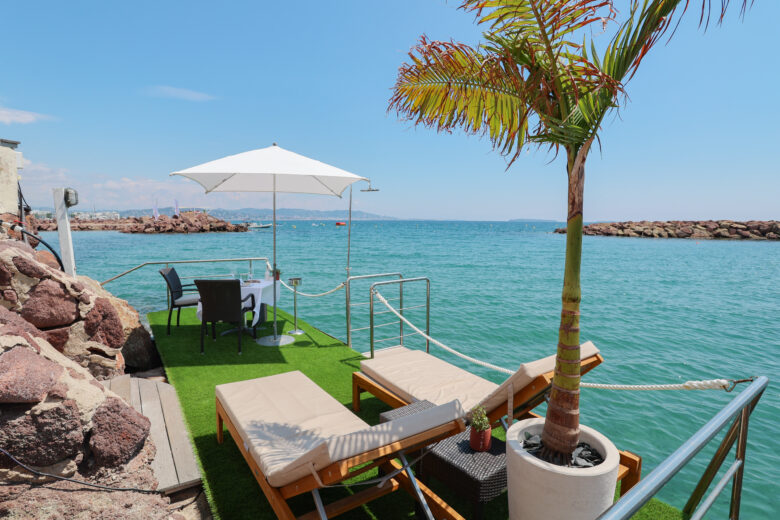 En prolongement de la salle du restaurant, l’immense terrasse sur la mer incarne à elle seule le symbole des beaux jours. On s’y donne volontiers rendez-vous pour savourer les mets du chef tout en contemplant le panorama sur la baie de Cannes ou en se délectant de sublimes couchers de soleil et ciels étoilés.