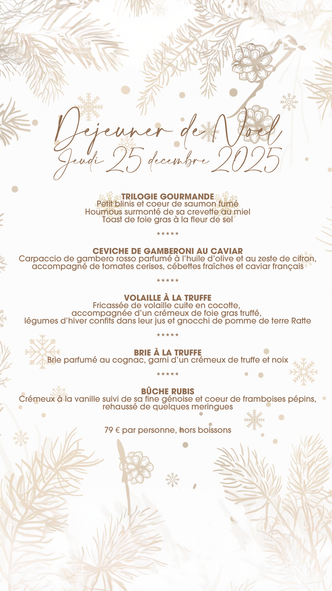 Join us on December 25th for an exceptional festive lunch. Our chef offers a refined menu celebrating the flavors of Christmas: from the gourmet trilogy to the delicate Bûche Rubis, featuring our truffle poultry.