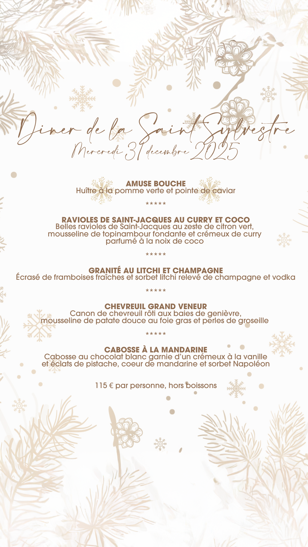 Celebrate the new year with us on December 31st for an exceptional dinner. Our chef offers a gastronomic menu highlighting refined flavors: scallop ravioli with curry and coconut, lychee and champagne granita, grand veneur venison, and our delicate mandarin cabosse.
